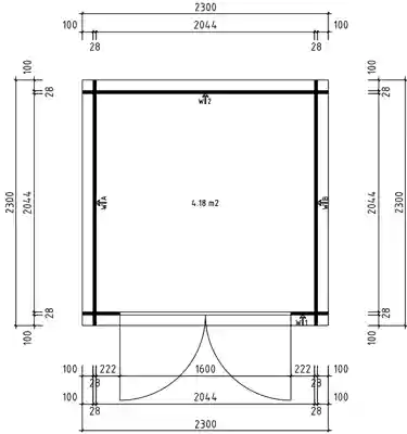 - Largeur (avec débord de toit) : 230 cm